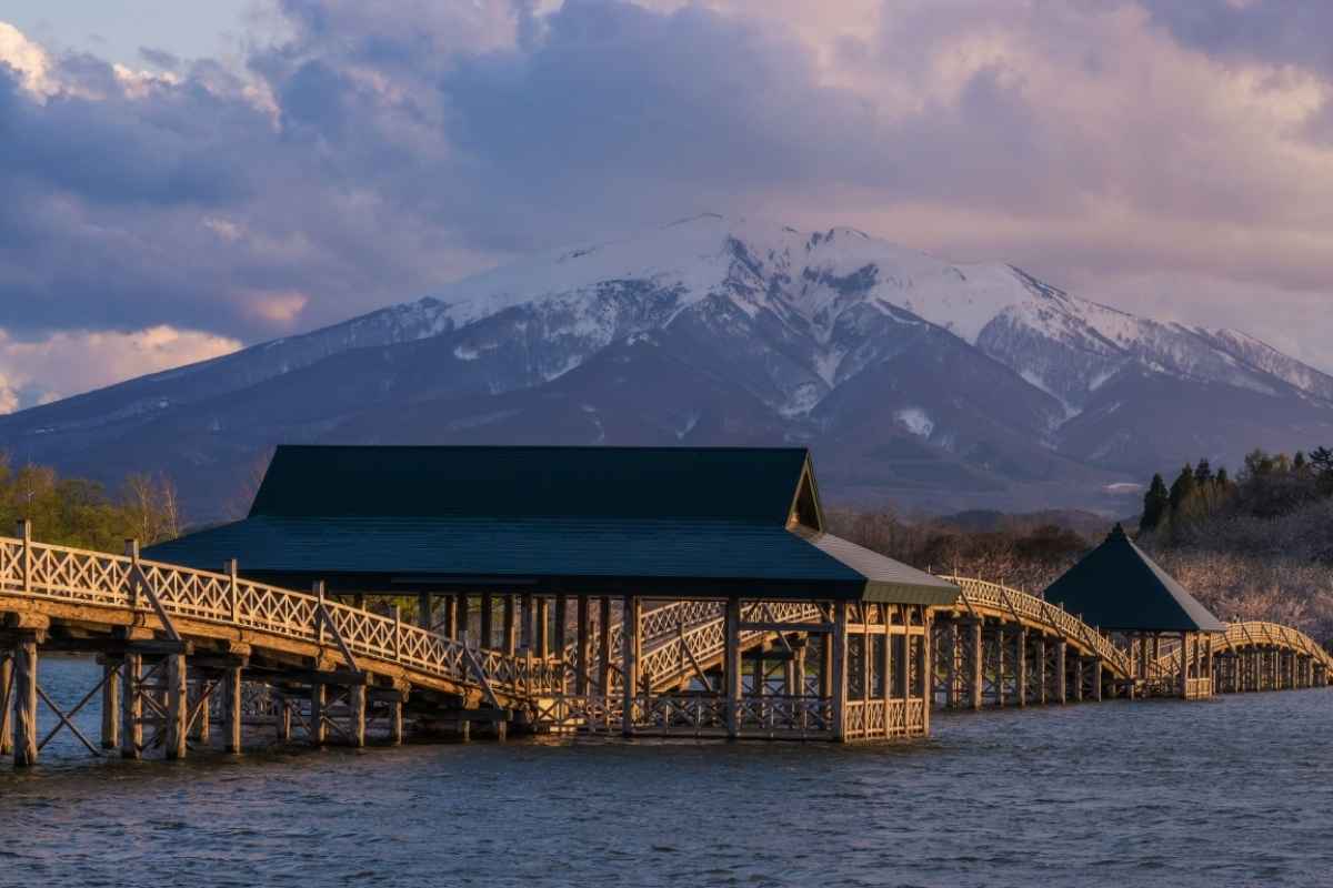 สะพานไม้โบราณที่ทอดยาวบนทะเลสาบ Tsuruta พร้อมฉากหลังเป็นภูเขาอิวากิ สวยมากทั้งฤดูร้อนและใบไม้ร่วง