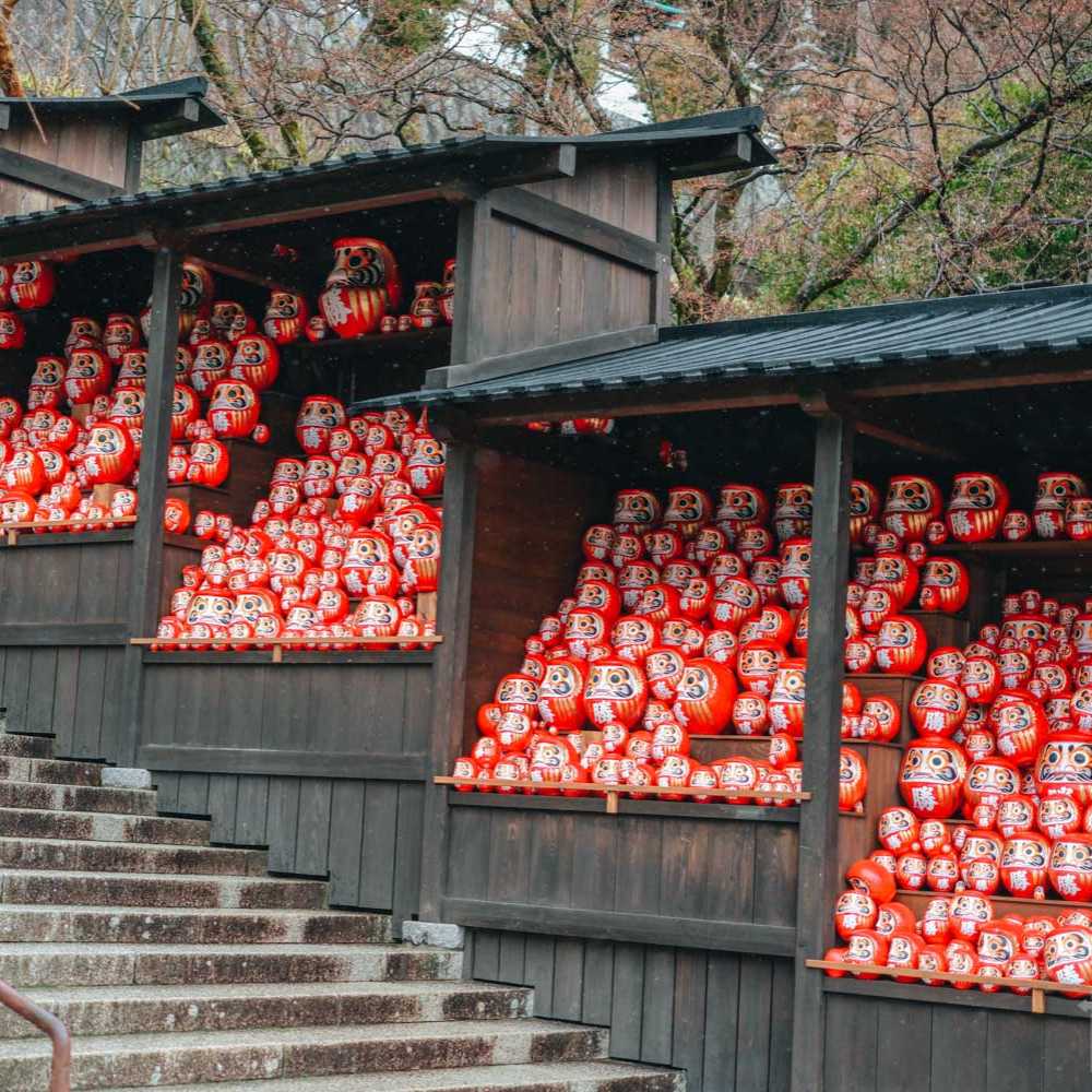 ภาพจำที่โดดเด่นที่สุดของวัดนี้คือ "ตุ๊กตาดารุมะ" สีแดงสดใสที่วางเรียงรายอยู่ทุกมุมวัด ตั้งแต่บันไดหินไปจนถึงซอกกำแพง ซึ่งดารุมะเหล่านี้คือสัญลักษณ์ของการไม่ยอมแพ้และชัยชนะที่ผู้มาเยือนนำมาถวายคืนหลังจากพรที่ขอไว้สำเร็จสมปรารถนา