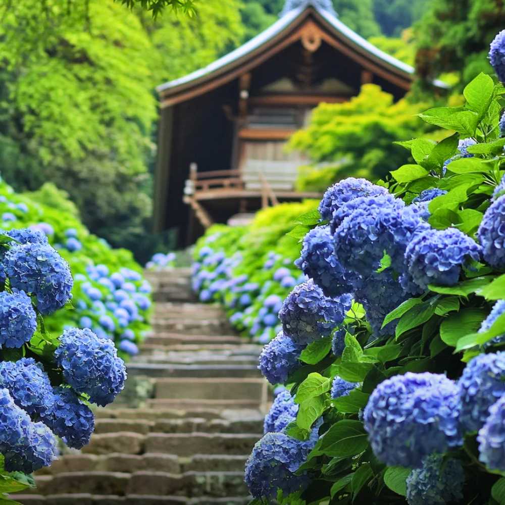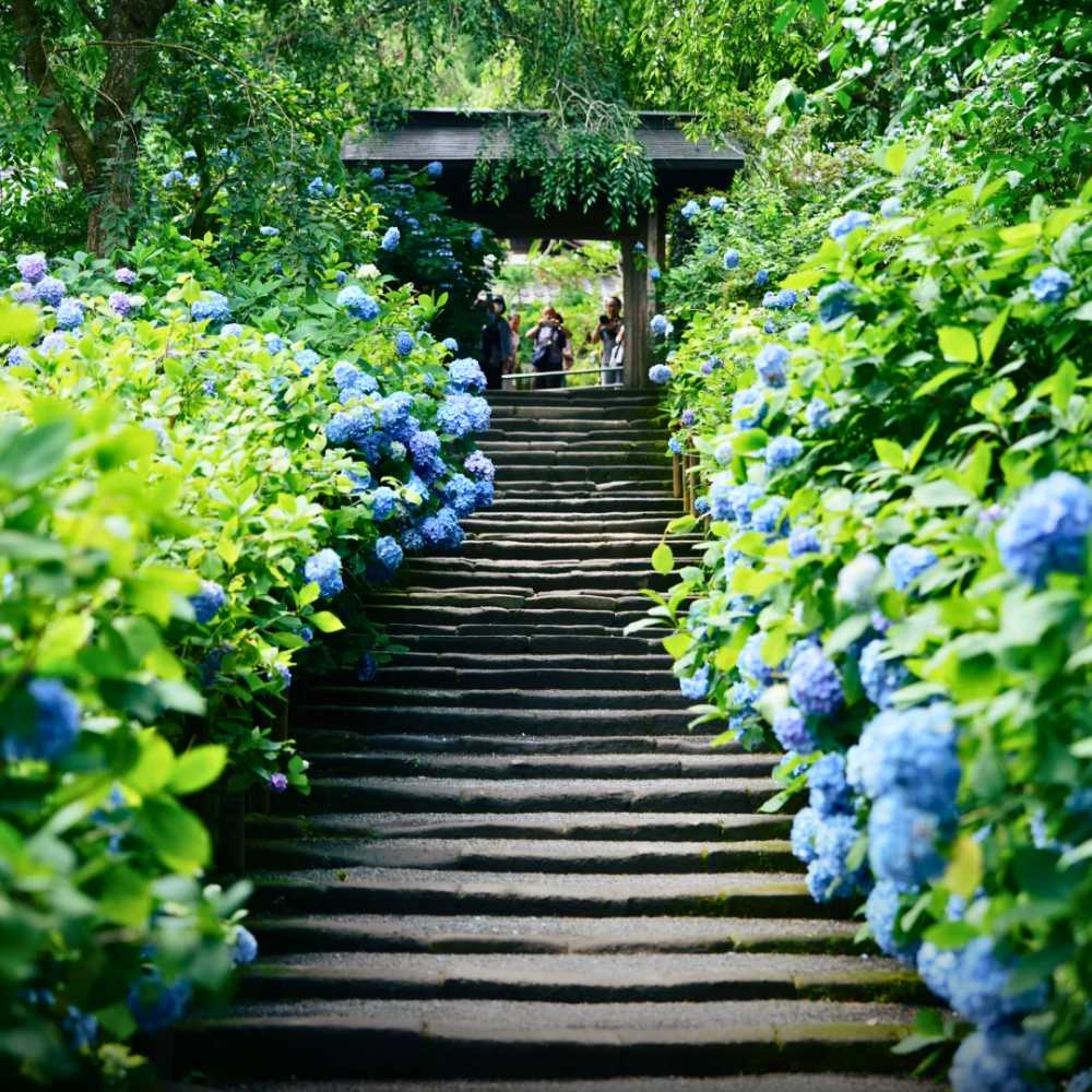 The Stone Stairs Path: ทางเดินบันไดหินที่โอบล้อมด้วยพุ่มไฮเดรนเยียสูงท่วมหัว เป็นมุมมหาชนที่สะท้อนถึงปรัชญาความงามแบบญี่ปุ่นได้อย่างสมบูรณ์แบบ